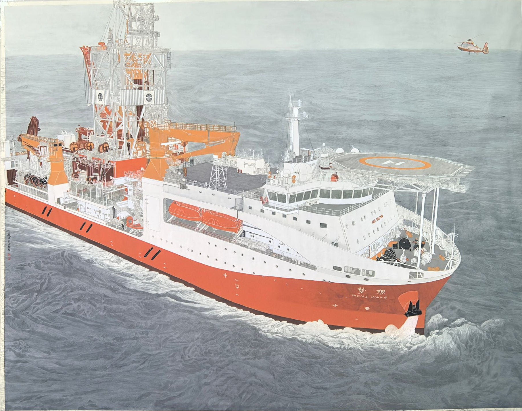 作品《梦想·起航》以我国自主设计建造的首艘超深水大洋科考钻探船“梦想”号为蓝本,在创作上实现了科技与艺术的深度对话。作品秉持“尽、精、微”的创作理念,传递出对大国重器的敬意,呼应“向海图强”的战略主题;通过细腻笔触描绘“梦想”号,既展现了文化自信,又体现了创新意识。在主题造型方面,描绘海洋时采用工笔“千浪万波”的画法,展现出船只破浪前行的动势,象征着科研攻坚精神;刻画船体借鉴宋代界画技法,强化钢铁质感,并用钉头鼠尾描呈现细节,刚柔相济。色彩设计上,主色调为青灰色,以矿物色描绘海洋,船体采用暖白与朱砂红警示色,在冷暖对比中营造和谐视觉效果。